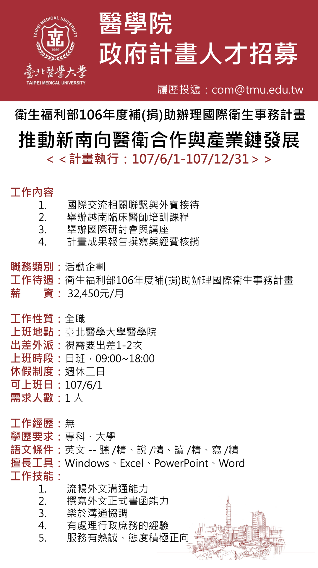 醫學院徵才訊息:衛生福利部106年度補(捐)助辦理國際衛生事務計畫助理乙名